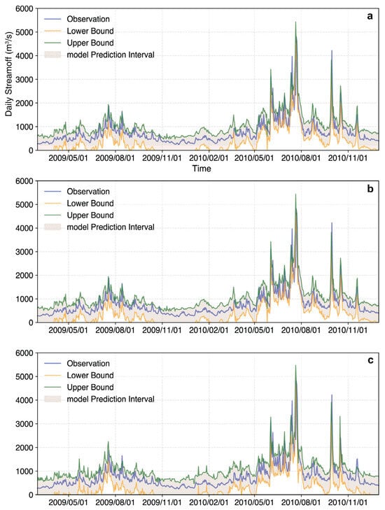 Figure 8 illustrates the error cumulative distribution functions (CDFs) for each horizon and highlights the derivation of the 90% confidence interval as an example. Specifically, for the 90% confidence level, the derived error intervals were [−323.22, 296.14] m3/s (1-day), [−381.49, 333.33] m3/s (3-day), and [−440.75, 398.34] m3/s (5-day). These results show a broadening of the error range with increasing lead time, reflected in the PINAW values. The dynamic behavior of the 95% PIs, which adapt to flow conditions by widening during high-flow and high-variability periods (e.g., mid-2010 flood events) and narrowing during stable, low-flow periods. This heteroscedastic behavior is consistent with hydrological expectations. In summary, the proposed model not only delivers accurate streamflow predictions but also generates reliable and context-aware uncertainty intervals, making it a valuable tool for operational hydrological forecasting and risk-informed water resource management at Chaoan Station. The corresponding CDFs of the prediction errors were calculated via integration to determine the upper and lower bounds corresponding to the target confidence levels, and the complete daily streamflow prediction intervals at the 90% confidence were then reconstructed in Figure 9.