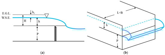 In recent decades, global warming and population growth have intensified climate change, influencing watersheds and water resources [1,2,3,4,5,6,7]. This matter, along with the increasing water needs of human societies, increases the requirement for the correct water distribution for sustainable development [8,9,10]. Additionally, inefficient irrigation and water distribution infrastructure due to the limited capacity of dams and maintenance requirements influence water resources management works [11,12]. Weirs could assist in reaching this aim through water level regulation and flood control in water distribution and conveyance networks in downstream regions [13,14]. Furthermore, weir safety in flood performance is of high importance [15]. Weirs can be classified based on specific characteristics, including cross-sectional shape, plan view, or crest length. From the point of view of cross-sectional shape, rectangular, triangular, parabolic, elliptic, and circular weirs are common types [16]. Investigating the discharge capacity of a weir crest length is an essential factor [17,18]. Hence, the importance of investigating weir design on the flow behavior over them, the flow discharge, and the flow characteristics downstream are apparent. Among weirs, full-width plate weirs (FWPW) are used in flow measurements and drainage purposes, as well as wastewater plants [19,20,21]. These weirs are plate structures perpendicular to the flow direction, providing conditions for the water flow to pass through the whole width of the weir crest (Figure 1).