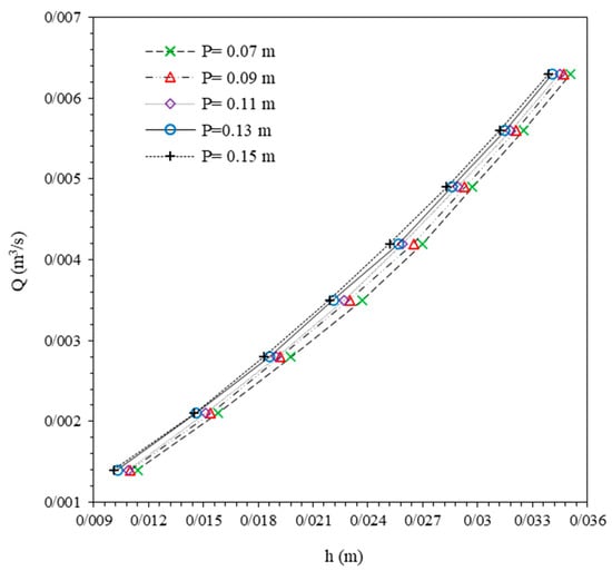 In all weirs, the flow discharge depends on the head on the weir, which, according to Equation (1), is the FWPW, which also follows this criterion. Figure 4 presents the results of water head variations measured upstream of the weir (with a distance of 30 cm from the weir) with flow discharge (measured by the flowmeter). It can be observed that in all weirs with different heights, the relationship between Q and h is approximately linear, consistent with previous research results [64]. Also, in constant discharge, with the increase of P, the weir head decreases slightly. These findings are in agreement with Chen et al.’s [65] study, where a similar linear relationship between flow discharge and head was observed for various weir heights. Additionally, Chanson [63] also reported that increasing the weir height leads to a slight decrease in the head at constant discharge, which aligns with the observations from the current study.