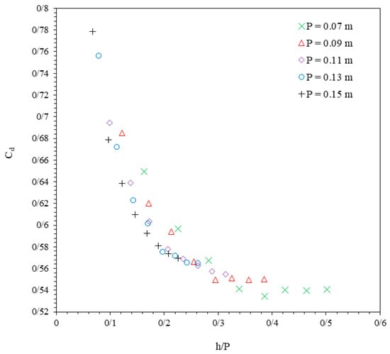 The discharge coefficient is one of the effective hydraulic parameters in the design of plate weirs. According to Equation (4), the most effective factor is h/P. Figure 5 shows the results of Cd with h/P changes for P = 0.07, 0.09, 0.11, 0.13, and 0.15 m. Discharge coefficients were calculated from Equation (1) by determining the measured flow discharge, weir head, weir length, and g. Observations indicate that the discharge coefficient of the FWPW has a decreasing nonlinear trend with the increase of h/P. This nonlinear decrease in Cd can be attributed to the fact that, as h/P increases, the flow over the weir becomes more turbulent, leading to a more significant amount of energy dissipation and reduced flow efficiency. At higher h/P values, the flow experiences a more considerable depth, which increases resistance and decreases the effective energy conversion, resulting in a lower discharge coefficient. This nonlinear trend observed in the current experiments is consistent with the findings of Arvanaghi and Oskuei [36], who observed similar behavior in their tests with varying h/P values. Additionally, Nouri and Hemmati [67] identified a decrease in discharge coefficient with increasing h/P, which is further validated by the data presented in this study.