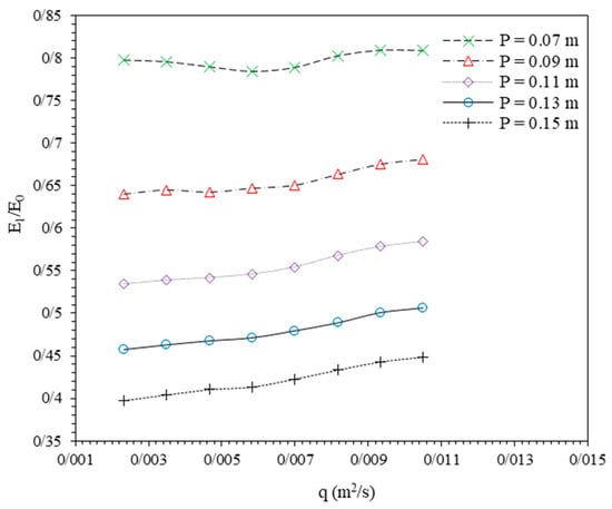 Figure 8 provided the variations of (E0−E1)/E0 with q changes. At a constant q, relative residual energy increases by increasing weir height. It could be observed that for flows with higher discharges, relative energy dissipation decreases with a slight slope. Average values of (E0−E1)/E0 were 0.2027, 0.3442, 0.4441, 0.5208, and 0.5783 for P = 0.07, 0.11, 0.13, and 0.15 m, respectively.