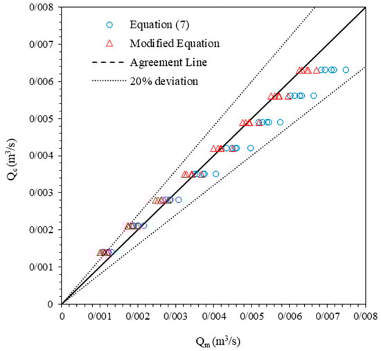 Comparison of calculated discharge (Qc) from Equation (7) and modified equation.