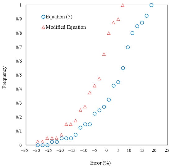 Figure 11 shows the frequency occurrence of errors for computed flow discharge from Equation (7) and the proposed equation with values observed in the experiments. For the proposed equation, the error ranges from −28% to 6.95%, and it ranges from −22.4% to 18.95% for Equation (7). As it is comprehended from the values of R2, RMSE, and MAE in Figure 10, both equations have calculated the values of flow discharge passing through the weir with the acceptable error. It can be observed from Figure 11 that the frequency occurrence of the errors in the proposed equation is less than in Equation (7). This finding is compatible with the values of R2, RMSE, and MAE in Figure 10 and confirms that the proposed equation is more efficient and reaches fewer errors compared with the previous equation. It means the proposed equation (Equation (8)) can predict the observed discharge better than Equation (7).
