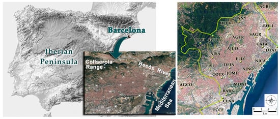 The city of Barcelona, with an approximate extension of 101 km2, is located on a small coastal plain bounded by the Mediterranean Sea to the east, the Collserola mountain range to the west (512 m in altitude at its highest point), the Llobregat River to the south, and the Besòs River to the north, with various hills scattered throughout the city. Barcelona features a dense rainfall network (Figure 1, Table 1), currently managed by the public company Barcelona Cicle de l’Aigua S.A. (BCASA), Barcelona, Spain, with the participation of the Barcelona City Council through its governing bodies. The pluviometric network, originally deployed and maintained by Clavegueram de Barcelona, S.A. (CLABSA, located in Barcelona, Spain), and now by BCASA, consists of high-resolution tipping bucket rain gauges, most of them operating continuously since 1996 [,,]; for this study, data from twenty-four of them have been used.