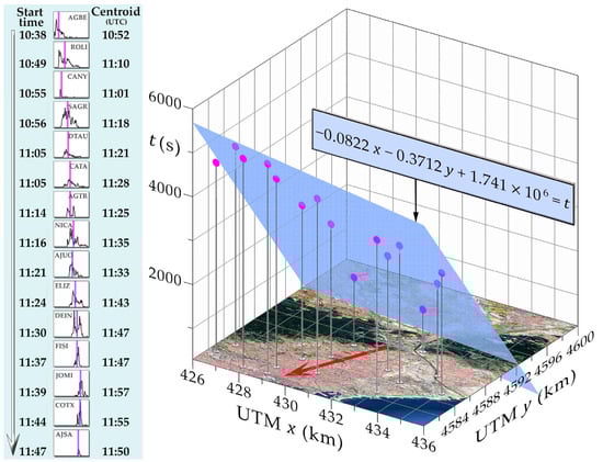 For a given storm, once the reference points for each rain gauge in the network have been determined, a set of experimental points is considered, with the coordinates of the gauge , and the time of the storm feature to be tracked. This set of experimental points is then fitted to a plane, defined by Equation (4) by the least squares method (planar regression) [].