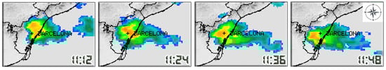 As an example, Figure 3 presents the planar regression for a rainfall event recorded by the urban network of Barcelona on 14 September 2009, where the hyetogram centroids for each of the 15 pluviometers that captured the storm are represented on the t-axis. The parameters of the fitted plane equation in this space (, , ), where longitude is represented by and latitude by , were determined as , and . This corresponds to a movement speed of , that is, towards the south–southwest . See also Figure 4, which presents a sequence of images from the radar operated by the SMC in Vallirana, a nearby town west of Barcelona. The images, captured at 12 min intervals, clearly show the storm moving approximately in a S–SW direction.
