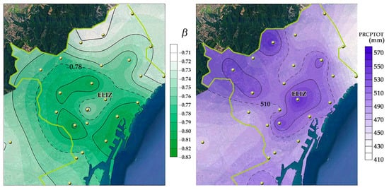 Having explored how the spatial patterns of rainfall variability evolve across different timescales through PCA, we now turn to examining their relationship with conventional rainfall metrics and indices. For instance, the scaling parameter has been calculated for each rain gauge in the network, a parameter that has been related to rainfall irregularity as well as to mean annual precipitation [,,,]. To explore these characteristics across the city, we interpolated the values from each rain gauge in the network. Figure 7 presents the resulting field, illustrating the spatial variation in this parameter over the study area, along with the interpolated field of average annual total precipitation (PRCPTOT). The comparison between both panels does not appear to reveal a strong similarity between the spatial patterns of and PRCPTOT. Instead, the field exhibits a structure of concentric bands around the center, resembling the typical urban heat island pattern.