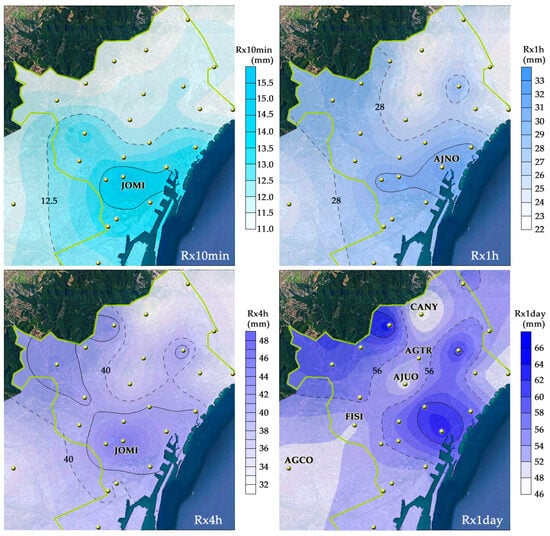 This weighted combination of the first principal components provides a summary signal for each station, capturing the most relevant spatial variation in rainfall intensity while accounting for the proportion of variance explained by each component. Importantly, because the values result from recombining standardized component scores weighted by their contribution to total variance, they partially reconstruct the dominant structure of the original data. As a result, stations with overall similar rainfall behavior across durations tend to yield similar values. This explains the presence of large, relatively uniform zones in the interpolated maps, where only a few distinct areas emerge. Figure 6 displays the interpolated scores of for durations of 10 min and 1, 4 and 24 h, allowing a visualization of the dominant spatial patterns that emerge when multiple principal components are considered together, as well as how these patterns evolve with the rainfall duration. For durations shorter than 30 min (represented in Figure 6 by the 10 min duration), the contour lines of the interpolated values form enclosed zones, distinguishing between the center–south and northern areas of the city. By the 1 h duration, these enclosed areas disappear, giving way to two broad regions: one more influenced by the mountainous orography, and the other closer to the coast. At the 4 h duration, the separation between coastal and orographic influences persists, though the boundary becomes more curved and a localized closed contour appears in the northern sector of the port area. At 24 h, a central enclosed zone emerges, encompassing most rain gauges while only excluding the stations at the periphery of the network.