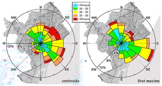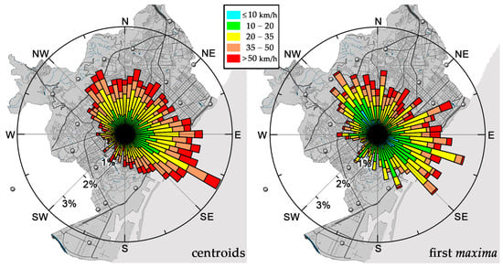 Figure 10 shows the storm direction and speed diagrams corresponding to the selection of 133 events that reached intensities defined by the SMC [] as heavy (20 mm in 30 min) and torrential (40 mm in 30 min) at one or more rain gauges. While the full dataset initially displayed a broad range of directions spanning from the northwest (NW) to southeast (SE), the subset of intense events revealed a slightly more balanced distribution. When monitored using the centroid method, this refined selection identified two distinct predominant movements: one toward the east–northeast (ENE), and a more marked one toward the east–southeast (ESE) and southeast (SE), all of them in the direction of the coast. Even so, other quadrants showed relatively higher proportions compared to the full set, indicating a slightly broader diversity in storm trajectories within the subset. In the case of the events tracked using the first maximum, the predominant directions are those toward the coast, with the exception of a subset of events moving toward the north–northwest (NNW), that is, perpendicular to the Collserola range. However, a notable 45% of the intense events recorded by the urban network moved toward the sea, a result consistently observed using both tracking methods.