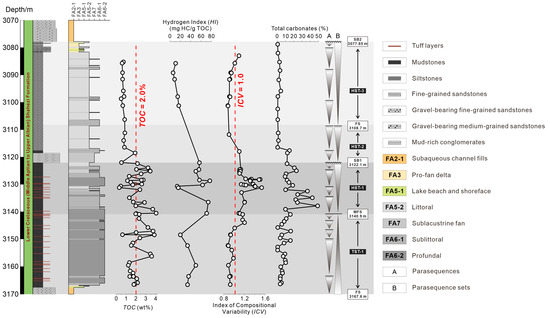 A measured section of the lacustrine-dominated interval from the JLYY1 borehole, illustrating the vertical variations in lithologies, facies associations, total organic carbon (TOC) content, hydrogen index (HI) values, Index of Compositional Variability (ICV), total carbonate content, stratal stacking pattern, sequence surfaces, and four depositional stages (TST-1 to HST-3) in the Shahezi Formation. The interpretation of facies association is adapted from Wang et al. (2025) [32].