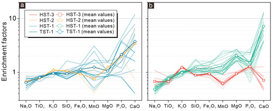 Variations in enrichment factors (EFs) of the major-element oxides in a sequence stratigraphic framework (TST-1 to HST-3), calculated from the Shahezi Formation mudstones (JLYY1 borehole). (a) The distribution pattern of enrichment factors in TST-1 and HST-2; (b) the distribution pattern of enrichment factors in HST-1 and HST-2. The EF values are calculated by normalizing the oxide concentrations to their reference values of Post-Archaean Australian Shale (PAAS).