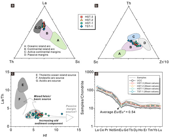 Rare earth element (REE) diagrams of the Shahezi Formation mudstones from the JLYY1 borehole, Lishu Rift Depression, illustrating the tectonic background and features of the protolith in the provenance area during the four depositional periods (TST-1 to HST-3). (a,b) La-Th-Sc and Th-Sc-Zr/10 ternary diagram, with base maps referenced from Bhatia and Crook (1986) [79]. (c) Hf versus La/Th diagram, with a base map referenced from Floyd and Leveridge (1987) [80]. (d) The distribution patterns of the chondrite-normalized REE concentrations in the Shahezi Formation mudstones, compared with those of the Upper Continental Crust (UCC, data referenced from McLennan (2001)) [81].