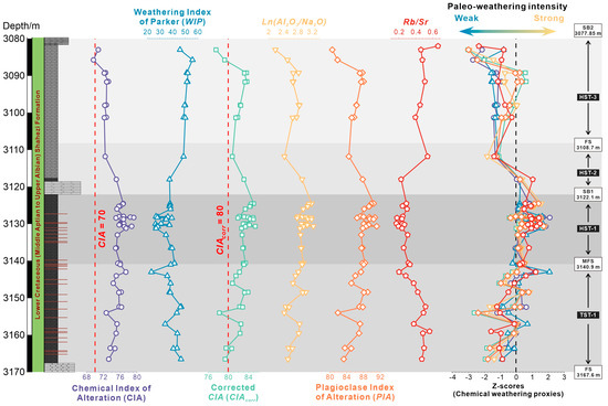 The chemical weathering indices (CIA, WIP, Ln(Al2O3/Na2O), PIA, and Rb/Sr) were combined with the compositional variation proxy (ICV) to determine the chemical weathering conditions of provenance and access paleoclimate evolution during the Shahezi Formation period. The z-scores were calculated to compare different chemical weathering indices with different ranges of values and to summarize a general vertical trend of weathering intensity within the sequence stratigraphic framework. As shown in Figure 6, the chemical weathering intensity of the Shahezi Formation exhibits a gradual increase from TST-1 to HST-1, followed by a general decrease from HST-1 to HST-3. All proxies suggest that the chemical weathering intensity reached its maximum during HST-1 (3124.52–3131.22 m), with CIA ranging from 75.01 to 79.23. The transition from HST-1 to HST-2 marks a dramatic shift in chemical weathering intensity, with CIA decreasing from 76.73 to 72.44. The HST-3 is characterized by the weakest weathering conditions (with CIA values approaching 70). Additionally, the upper portion of HST-3 (3089.19–3091.69 m) records a short-time enhancement of chemical weathering, as evidenced by Ln(Al2O3/Na2O) and PIA values.