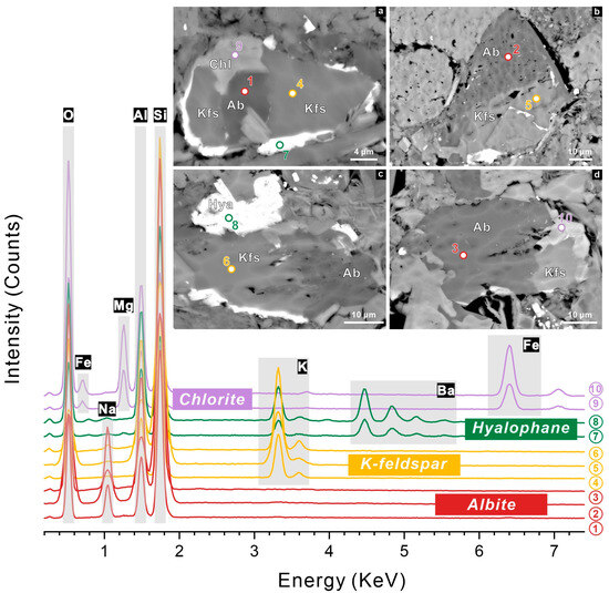 Backscattered SEM photomicrographs (a–d) and EDS spectra (numbers 1 to 10) of marine mudstone samples from the Lower Silurian Longmaxi Formation in the Sichuan Basin, South China (He201 borehole, 4073.8 m). The circles marked by numbers 1 to 10 represent the locations of EDS point analysis. These samples have undergone potassium and barium metasomatism as a result of hydrothermal activity. All images illustrate the replacement of primary albite by neoformed K-feldspar and hyalophane, which occur at grain rims and along cleavage planes. Hyalophane (K,Ba)[(AlSi)4O8] represents a barium-rich potassium feldspar formed under low-temperature conditions. Mineral abbreviations: albite (Ab), K-feldspar (Kfs), chlorite (Chl), and hyalophane (Hya).