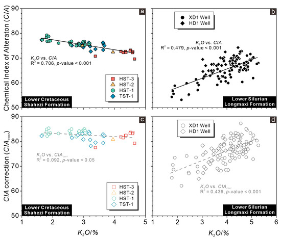 (a,b) Cross plots showing the relationship between the bulk-rock K2O content and Chemical Index of Alteration (CIA) values for the Shahezi and Longmaxi Formations. (c,d) Cross plots of %K2O versus corrected CIA values (CIAcorr) for the Shahezi and Longmaxi Formations. For the Shahezi Formation samples, the negative or insignificant correlation indicates that the breakdown of intraformational K-feldspar did not result in excess K2O addition to the bulk rock. In contrast, for the Longmaxi Formation samples, the positive correlation suggests that potassium addition, driven by hydrothermal activities and expressed through plagioclase replacement, can increase the bulk-rock K2O content. Major element data of the Longmaxi Formation are sourced from Wang (2021) [74].