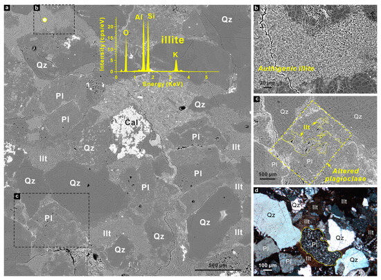 Backscattered SEM images of a sublittoral lacustrine mudstone sample from the Shahezi Formation (JLYY1 borehole, 3166.52 m). The sample is identified as horizontally stratified, non-laminated, and with argillaceous mudstone lithofacies in Wang et al. (2025) [32]. (a,b) Thin-shelled bivalve fragments containing clay minerals, authigenic quartz, and pyrite framboids; (b) is an enlarged view of a region within (a), highlighting the occurrence of these minerals. (c) Close association of authigenic quartz, chlorite blades, altered plagioclase, calcite, and illite mineral matrix. (d) Detrital quartz silt floating within a mineral matrix composed of chlorite, illite, calcite, quartz, and organic matter particles.