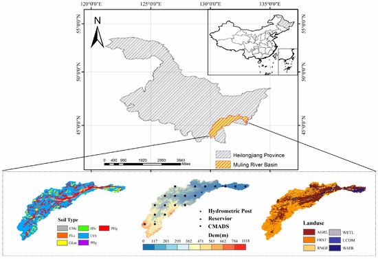 The river basin is located in the middle and temperate continental monsoon climate zone, with a hot and rainy summer and cold and long winter. The annual average temperature is 3.2 degrees Celsius, the highest temperature is 37.6 °C, and the lowest temperature is −44.1 °C. The annual average precipitation is 552.9 mm, and the precipitation distribution is uneven within the year. The precipitation from June to September accounts for about 70% of the annual precipitation, and the annual average runoff is 1.84 billion m3. The frost-free period lasts 140 days, and the freezing period lasts 150–160 days. There are four kinds of soil on both sides of the Muling River, namely gleyic soil, black soil, rudiment soil, and alluvial soil. Except for the cities in the upper reaches, most of the other areas are forest farms or farms. The vegetation belongs to the mixed coniferous broad-leaved forest community, the land utilization rate is high, there is basically no unused land, the cultivated land is mainly corn, soybean, wheat, rice, and potato, and a small area has sugar beet and other cash crops. There is a large water conservancy project, the Struggle Reservoir, in the upper reaches of Muling River. The drainage area above the dam site is 1740 km2, the total storage capacity is 191 million m3, and the annual average power generation is 1297 × 104 kW·h; an overview of the study area is shown in Figure 1.