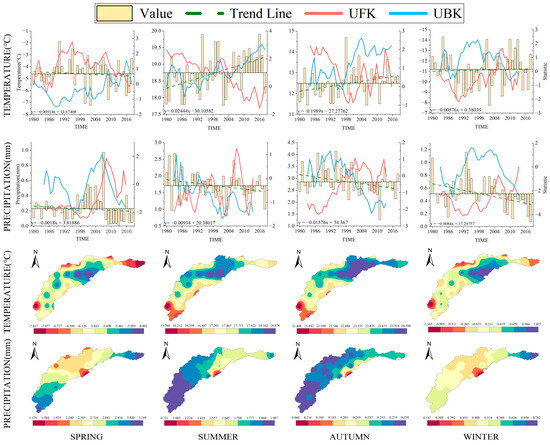 Annual mean temperature and precipitation, and quarterly mean temperature and precipitation. UFK: forward sequence statistic. UBK: backward sequence statistic.