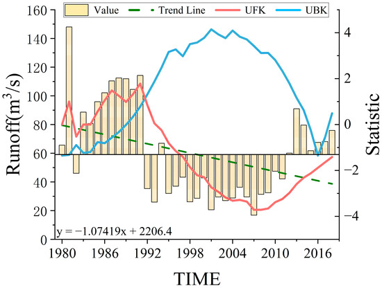 Mann–Kendall test is a non-parametric statistical test method, which does not require samples to follow a certain distribution and is less affected by outliers, and can characterize well the trend change characteristics of time series, so it is generally applicable to the significance test for time series trends. The identification of an abrupt runoff year is of great significance for separating the impacts of climate change and human activities on runoff. The abrupt runoff period is determined by the M-K trend test method, considering the abrupt characteristics of multiple influencing factors that affect the change in runoff.