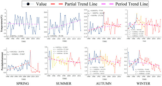 Temperature and precipitation variations in different seasons in the Muling River basin. Different colored Value values in the graph represent different periods of mutation.