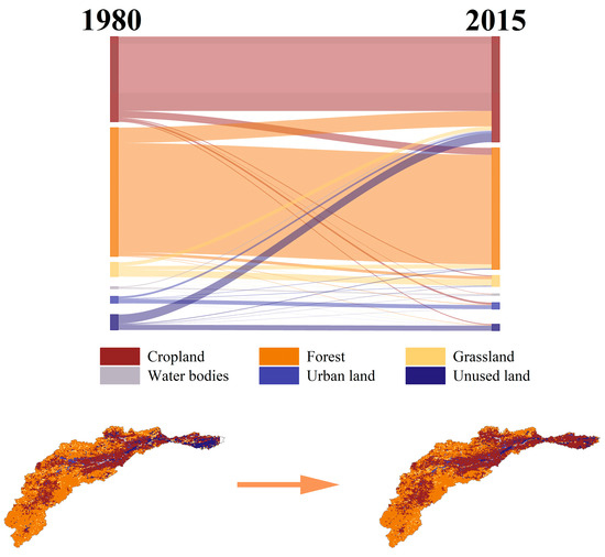 The land use types in the Muling River basin changed from 1980 to 2015.