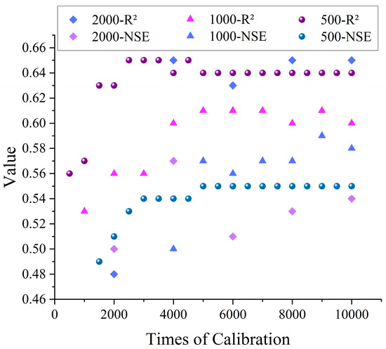 In SWAT-CUP, the SUFI-2 algorithm is adopted for parameter calibration, which adopts Latin hypercube sampling, which is a sampling method that can divide different parameter spaces into equal intervals to achieve a more efficient and uniform exploration of multidimensional parameter space. In hydrological models, different parameters have great influence on each other. Therefore, finding the right number of single calibration times can better exert the efficacy of the SUFI-2 algorithm. In order to explore the influence of different calibration times on the simulation results, the total calibration times were set to 10,000 times, and the single calibration times were set to 500, 1000, and 2000 (the maximum value of single calibration), respectively. The calibration results are shown in Figure 6.