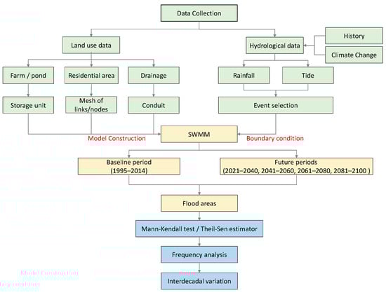 To analyze the interdecadal variations in compound flooding, a compound flood risk simulation framework was proposed using the consequence-based statistical method, as shown in Figure 2. In this framework, flood risk is defined as the probability of a flood hazard and is analyzed based on the exceedance probability of flood areas induced by the compound effects of rainfall and tide across historical and future periods following a three-step process. First, as indicated in green, land use data were processed for model construction, with different land use types represented by corresponding components in the SWMM. Rainfall and tidal data were collected and used as boundary conditions for flood simulations in both historical and future periods. Second, as indicated in yellow, the SWMM was applied to simulate the annual maximum flood areas (AMFA) for the baseline period (1995–2014) and four future periods, including the short-term (2021–2040), mid-term (2041–2060), medium–long-term (2061–2080), and long-term (2081–2100) periods, respectively. The flood area was defined as the area with water depths greater than 0.5 m, which corresponds to the threshold for eligibility for flood relief funds in Taiwan. Finally, as indicated in blue, the Mann-Kendall test, Theil-Sen estimator, and frequency analysis were conducted to evaluate the interdecadal variations in flood areas across the five periods.