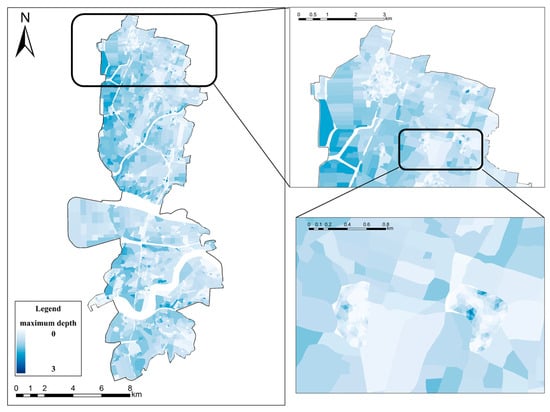 Figure 4 presents the simulated flood areas for Rainstorm 0612, with the validation indicators summarized in Table 2. The simulated flood areas were compared with the observed flood areas collected by local disaster prevention personnel through post-event field surveys. The average values of OCR, HTR, and FAR are 0.79, 0.81, and 0.18, respectively. These results indicate that approximately 80% of the actual flooded areas were correctly predicted by the model, while 18% of the unflooded areas were falsely identified as flooded. This inaccuracy may be attributed to the use of a 1D model in areas with complex 2D terrain features, which cannot be adequately represented by a 1D approach. However, the low FAR demonstrates that the high HTR value was not achieved through excessive overestimation but rather through a generally accurate delineation of flooded and unflooded areas. Overall, the model exhibits good consistency between simulation and observation for historical events and can be considered a reliable tool for future simulations under climate change scenarios.