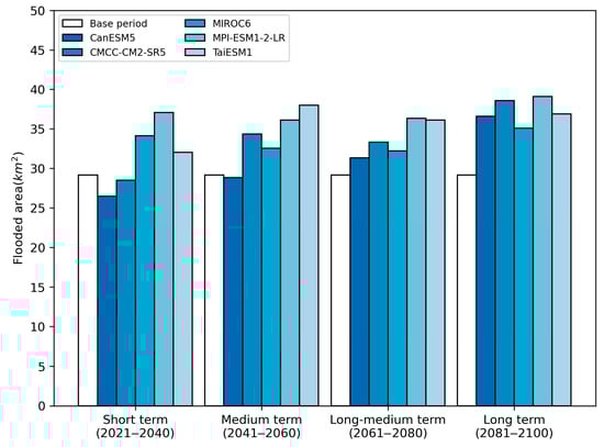 For the future periods, the best-fit CDFs of flood areas derived from different GCMs are presented in Figure 7. The results show that the CDFs exhibit the greatest divergence in the short-term period (2021–2040) and gradually converge over time by shifting to the right, as seen in the long-term period (2081–2100). This rightward shift indicates a rising trend in flood risk under future climate scenarios. Overall, MPI-ESM1-2-LR projects the highest flood risk, with the largest flood areas corresponding to the same cumulative probability levels. In contrast, CanESM5 yields the lowest flood risk, particularly during the short-, mid-, and medium–long-term periods. Table 4 summarizes the variations in flood area return periods (FARPs) across the baseline and future periods. During the baseline period, the flood areas associated with return periods of 2, 5, 10, 20, 50, 100, and 200 years are 28.3, 32.1, 34.6, 37.0, 40.1, 42.4, and 44.7 km2, respectively. When applying these same flood area thresholds to the future scenarios, the corresponding FARPs become shorter for all GCMs, except for a slight increase in the short-term period under CanESM5. This general reduction in FARPs implies that flood events of a given magnitude are expected to occur more frequently, indicating a substantial increase in future flood risk. Moreover, the reduction in FARPs is more pronounced at higher return periods. Compared to the baseline, the FARPs for a 200-year flood area decreased by 187.9, 194.7, 179.1, 195.6, and 193.2 years in the long-term period for CanESM5, CMCC-CM2-SR5, MIROC6, MPI-ESM1-2-LR, and TaiESM1, respectively.
