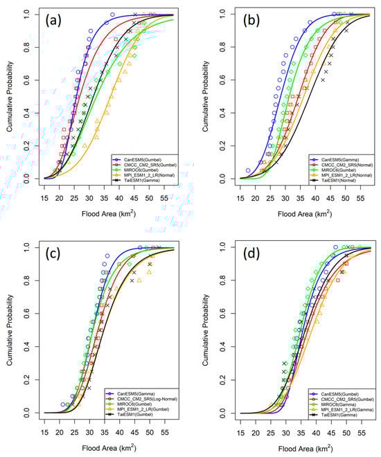 Flood area CDFs for different GCMs in future periods: (a) 2021–2040, (b) 2041–2060, (c) 2061–2080, and (d) 2081–2100.