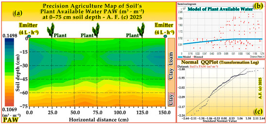 As an example, the soil profile pattern of PAW (m3·m−3) is plotted in a precision agriculture profile map (Figure 1a), accompanied by a semi-variogram plot of PAW (Figure 1b) and a normal QQ Plot by log transformation (Figure 1c). In addition, the transformed parameters with the Box−Cox transformation were θsat and Ks.