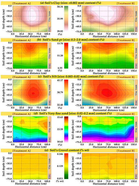 Ten precision agriculture profile maps of (a) clay (size: <0.002 mm), (b) sand pr (size: 0.2–2 mm), (c) silt (size: 0.002–0.02 mm), (d) Vfs sand (size: 0.02–0.2 mm), and (e) gravel (N = 60 for each parameter).