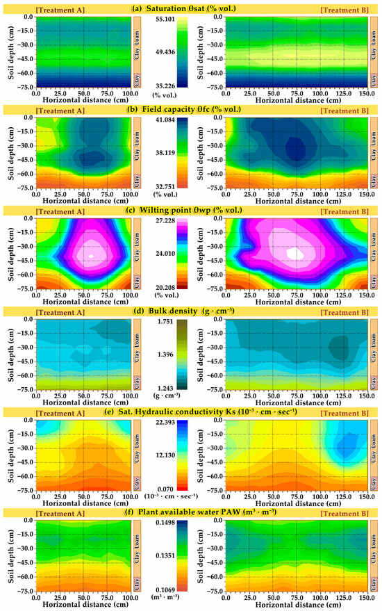 The developed maps of PAW (Figure 3f) showed a congruent positive variation pattern to Ks maps (Figure 3e) with rcc = 0.816 (p = 0.01, 2-tailed) and a negative pattern with BD maps in Figure 3d (rcc = −0.777). Soil hydraulic properties are intrinsically interrelated, and similar results have been reported in other studies [2,16,79,115,116,117,118,119,120,121]. The generated twenty-two PA rootzone profile maps of the soil’s hydraulic and textural parameters visualize the spatial variation of these variables and could be potentially applied to site-specific TDR sensor measurements and management zones (MZ) in precision agriculture.