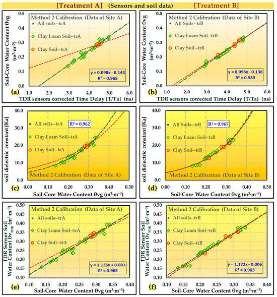 Representative diagrams of treatments A and B for sensor calibration method 2 (N = 60 for each parameter) in the 1st experimental week: (a,b) TDR sensors corrected time delay vs. soil-core θvg, (c,d) θvg vs. soil dielectric constant Ka, (e,f) θvg vs. TDR sensors SWC θvTDR.