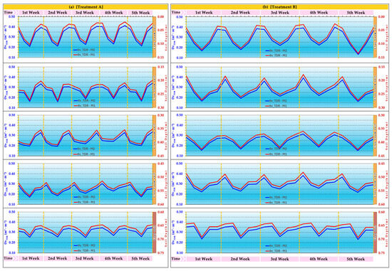 Dynamic diagrams of moisture (N = 60 for each parameter in every experimental week) spatiotemporal changes over time, at different soil depths and textures for sensor calibration methods M1 and M2, of (a) treatment A and (b) treatment B.