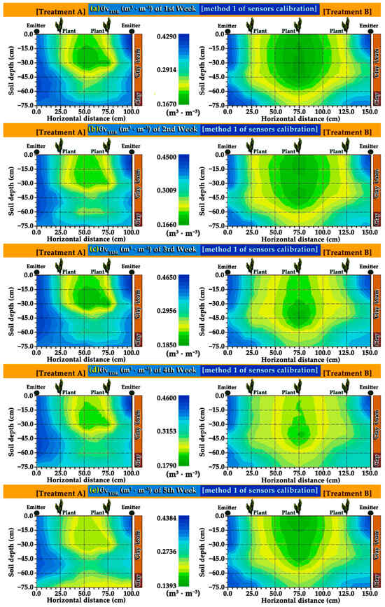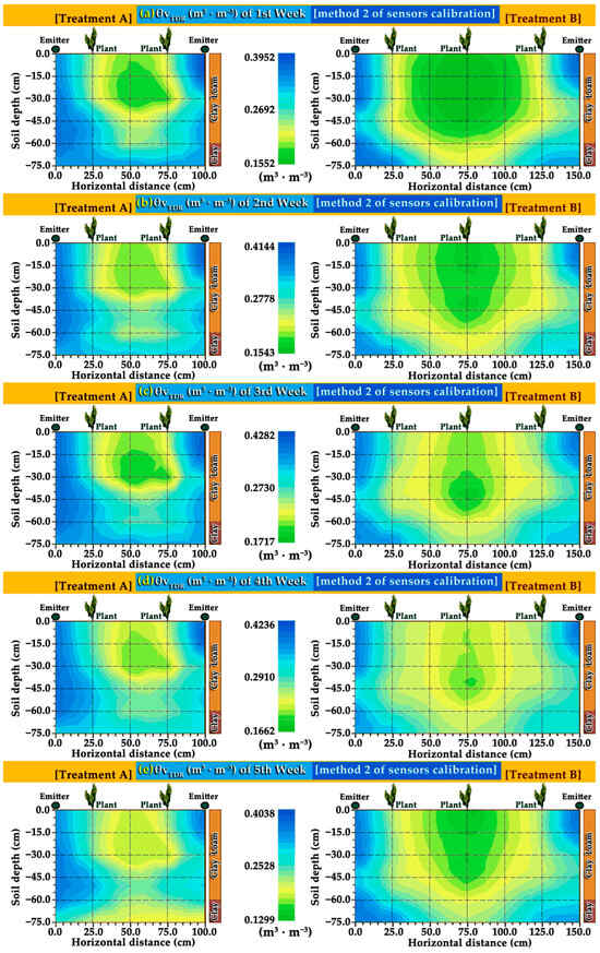 In Figure 5a,b, dynamic diagrams of treatments A and B are depicted, with spatiotemporal changes in soil moisture over time of the experiment at different soil depths and textures for sensor calibration methods 1 [67] and 2 [73], to demonstrate the spatiotemporal distribution patterns of SWCs in the traditional way. There are many differences between the spatiotemporal distribution patterns and measurement values of SWCs at different soil depths. in treatments A and B (Figure 5a,b), between method 1 [67] and method 2 [73] of the time domain reflectometry sensor calibration methods, and between the textures of clay loam and clay soils.