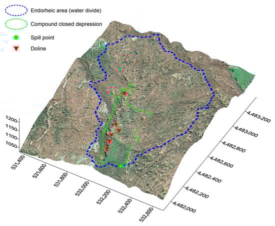 Morphologically, a closed depression is an area with a lower elevation than the surrounding terrain and concave upward [24]. Hydrologically, a closed depression drains a wider endorheic area, representing a closed watershed with internal runoff [25,26]. The term endorheic basin can also be found in the literature [25]. In endorheic areas, runoff is entirely absorbed through concentrated infiltration via ponors and diffuse infiltration and leakage through the cover deposits. Ponors placed at their bottom can create a direct hydraulic connection between the endorheic area and one or more springs [27]. Therefore, the amount of water conveyed toward the closed depression and contributing to groundwater recharge depends the endorheic area. Outside endorheic areas, runoff can escape and does not contribute to recharge, especially during intense rainstorms [15].
