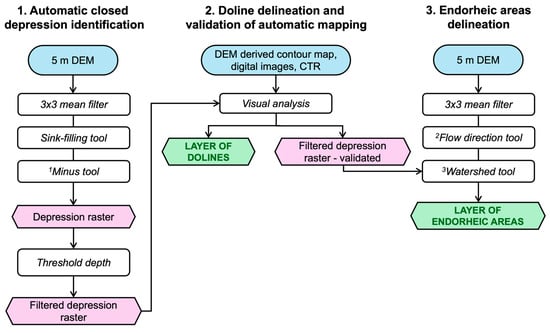 The delineation of endorheic areas begins with the identification of closed depressions. Note that even ponors represent points of concentrated recharge and should be included in the mapping [20]. However, ponor localization generally requires field surveys.