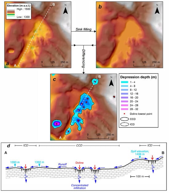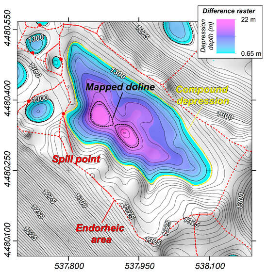 A widely used automatic, quantitative mapping approach combines the hydrological processing of a DEM and morphometric analysis of the mapped depressions (e.g., [49]). (i) Hydrological processing aims to calculate the so-called “difference raster” to determine the location and depth of the closed depressions (Figure 4; [5]). This raster is obtained by subtracting the original DEM from the depression-less DEM obtained by applying a sink-filling algorithm [50,51,52]. (ii) Not all the depressions identified in such a way represent true geomorphic karst features. A method to discriminate false depressions from actual ones is selecting a set of true karst depressions and measuring their morphometric attributes. Then, an optimal threshold for each attribute is defined to filter out potentially false features with “anomalous” characteristics. Although this method reduces the number of false depressions, even true karst depressions may be eliminated.