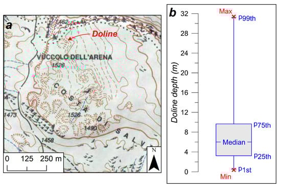 (a) Extract of the 1:25000 IGMI topographic map showing the location of some dolines (“–” symbol). (b) Box-plot showing the frequency distribution of doline depths, based on features mapped by the IGMI map (186 samples). The 99th percentile, p99th, is 0.65 m.
