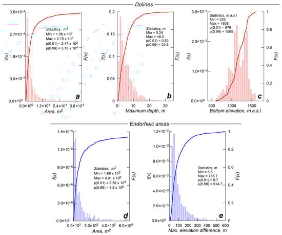 Probability density distribution, f(x), and relative cumulative frequency, F(x), of dolines (a–c) and endorheic areas (d,e) for different morphometric features (area, maximum depth, and bottom elevation). The main statistics are provided by figures.
