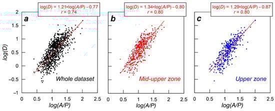 (a) Correlation between doline area/perimeter ratio, A/P), and mean depth, D (log–log plot): (a) whole sample; (b) mid-higher elevation dolines (1050–1250 m a.s.l.); (c) higher elevation dolines (>1250 m a.s.l.).