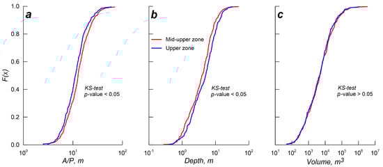 Cumulative frequency distribution (log x-scale) of two doline data sets, sampled in the mid-upper zone (1050–1250 m a.s.l., N = 413) and upper zone (>1250 m a.s.l., N = 345) of the karst massif. Different morphometric parameters were analyzed: (a) area/perimeter ratio, A/P; (b) mean depth; (c) volume. The figure also shows the results of the Kolmogorov–Smirnov test (KS-test) (p-value < 0.05, significant difference between the two distributions; p-value > 0.05, no significant difference between the two distributions).