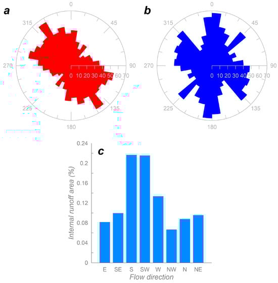 Rose diagram showing the orientation of the major axes of dolines (a) and endorheic areas (b). (c) Bar plot showing the percentage of the internal runoff area in relation to flow direction.