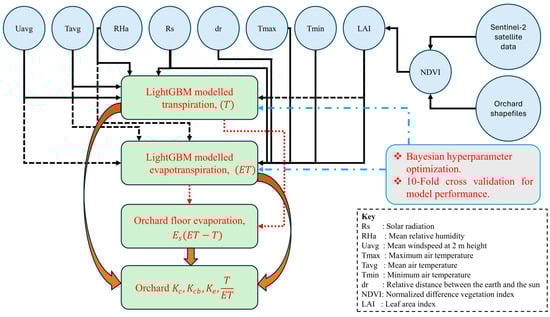 We proposed machine learning models for estimating evapotranspiration and transpiration based on the LightGBM model (Figure 2). In this current study, canopy interception () was assumed to be lost via evaporation. Thus, the total orchard evaporation () was taken as the sum of soil evaporation, and transpiration from understorey vegetation. Therefore, was calculated as the difference between the modelled orchard evapotranspiration and tree transpiration (). The set of input variables for the machine learning models (Figure 2) was selected because it represented key parameters in the evapotranspiration and transpiration mechanisms.