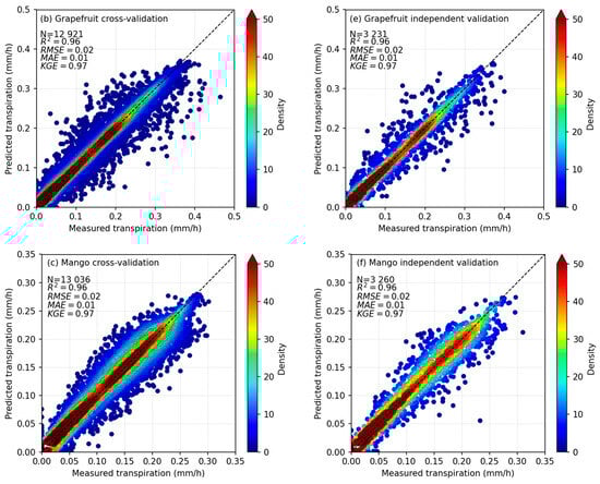 Performance of the Bayesian optimized LightGBM learning model in predicting transpiration using 10-fold cross-validation for (a) litchi, (b) grapefruit, (c) mango, and the corresponding model independent validation for (d) litchi, (e) grapefruit, (f) mango, respectively.