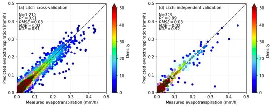 Performance of the Bayesian optimized LightGBM learning model in predicting evapotranspiration using 10-fold cross-validation for (a) litchi, (b) grapefruit, (c) mango, and the corresponding model independent validation for (d) litchi, (e) grapefruit, (f) mango, respectively.
