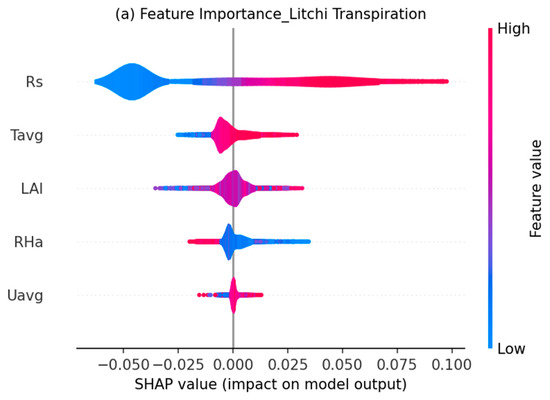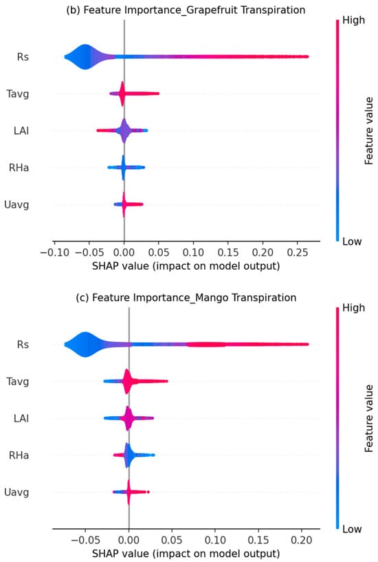 SHAP summary plot of the transpiration prediction for (a) litchi, (b) grapefruit, (c) mango.