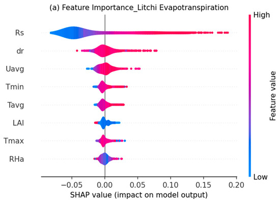 The had the largest influence on the litchi evapotranspiration model, followed by , , , , , , and , respectively (Figure 7a). For the grapefruit, showed the highest impact on the modelled evapotranspiration, followed by , , , , , , and , respectively (Figure 7b). Among the input predictors for the mango evapotranspiration model, exhibited the largest impact on the modelled evapotranspiration, followed by , , , , , and , respectively (Figure 7c). The and exhibited the largest influence on all the evapotranspiration models for the three crops, and , , , indicated a positive correlation with the modelled evapotranspiration (Figure 7a–c).