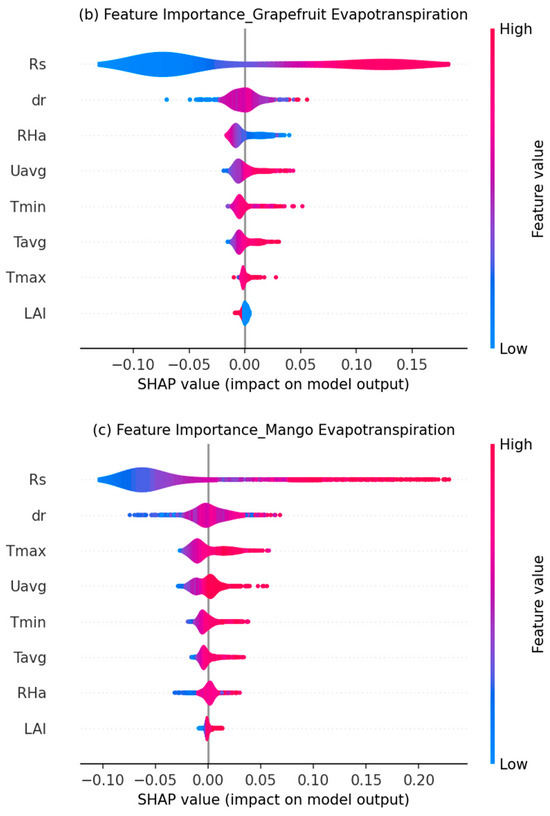 SHAP summary plot of the evapotranspiration prediction for (a) litchi, (b) grapefruit, (c) mango.